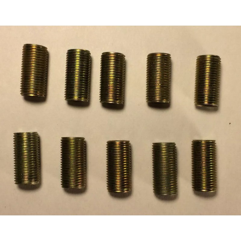 Lot of 10 new 1/8 IP (3/8" outside diameter) 1" long seamless steel running threaded nipples. These nipples have a rust resistant yellow zinc plate. #TN362