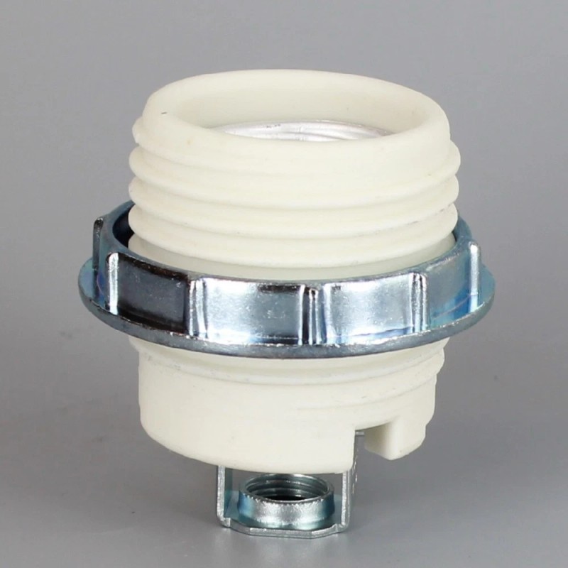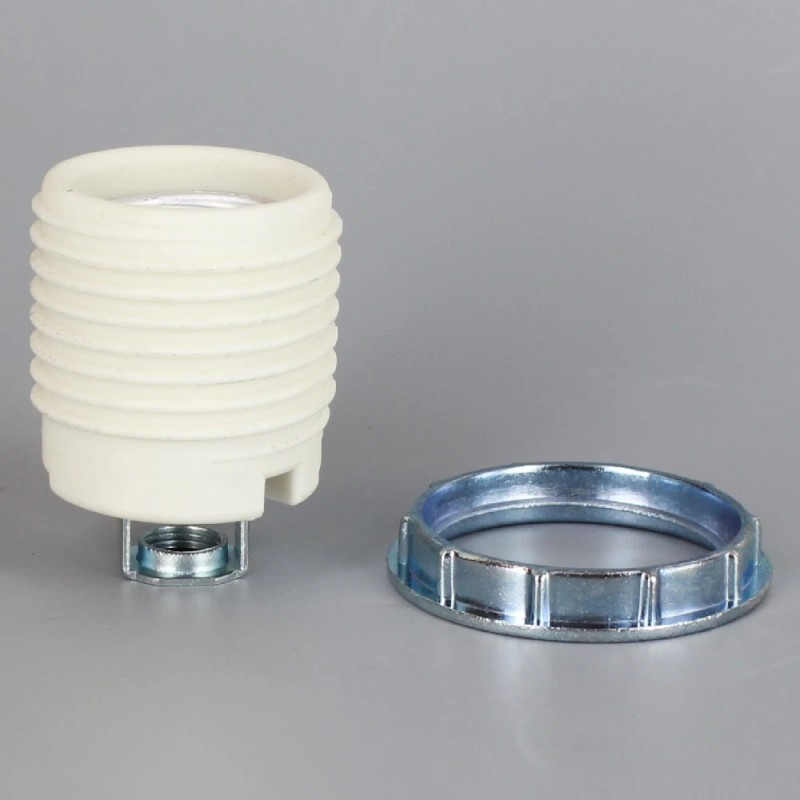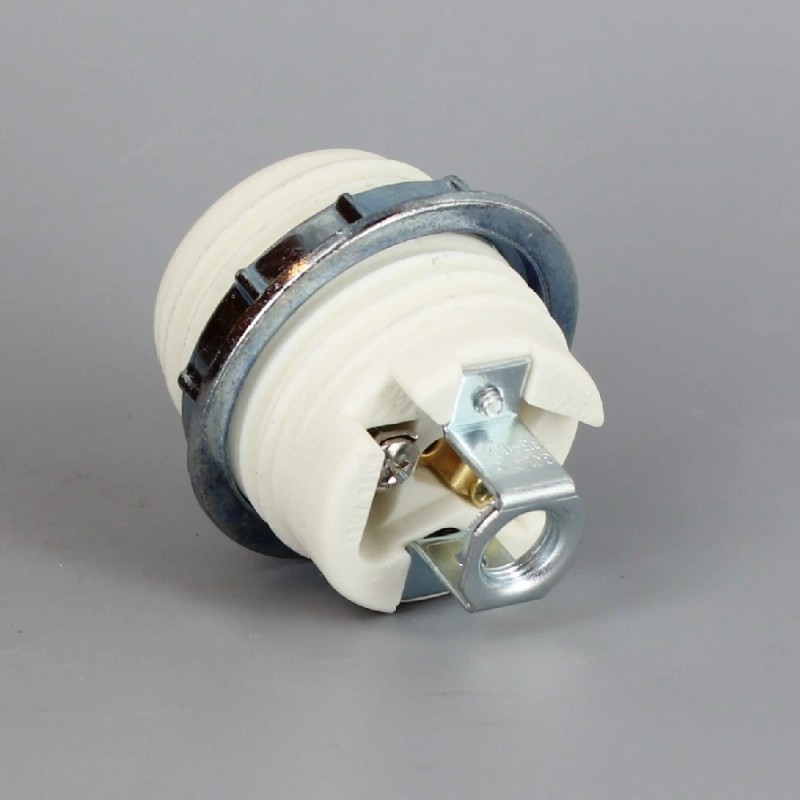 NEW E-26 PORCELAIN THREADED SKIRT SOCKET WITH 1/8IPS HICKEY AND SCREW TERMINAL WIRE CONNECTION. INCLUDES METAL RING. RATED MAXIMUM 660W 250V. Metal Ring 2in OD