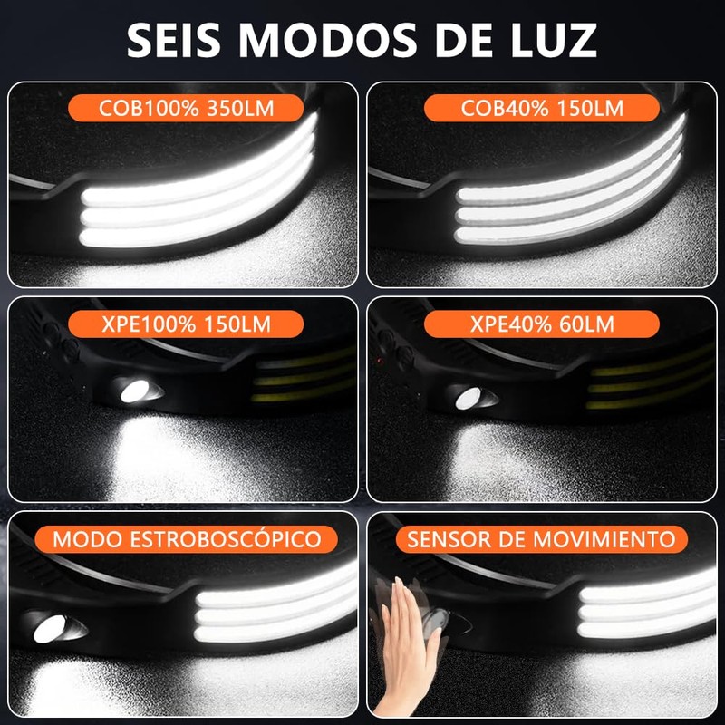 Lampara Cabeza 2PCS,Linterna Cabeza LED de Detección Inteligente Recargable,Iluminación Gran Angular 230 °,Linterna con 6 Modos Luz Sensor Movimiento,para Acampar, Caminar