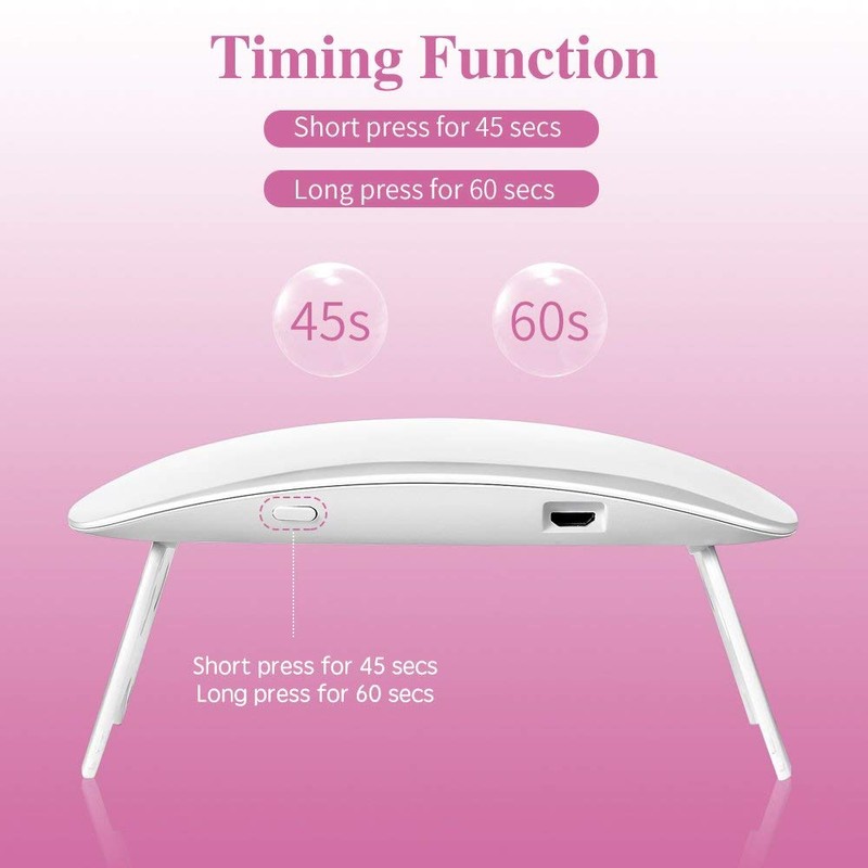 2.Usa el apropiado temporizador(presiona el botón de encendido una vez para el curado de 45s, presiona largo de 2 segundos para el curado de 60s) de acuerdo con los requisitos de gel.