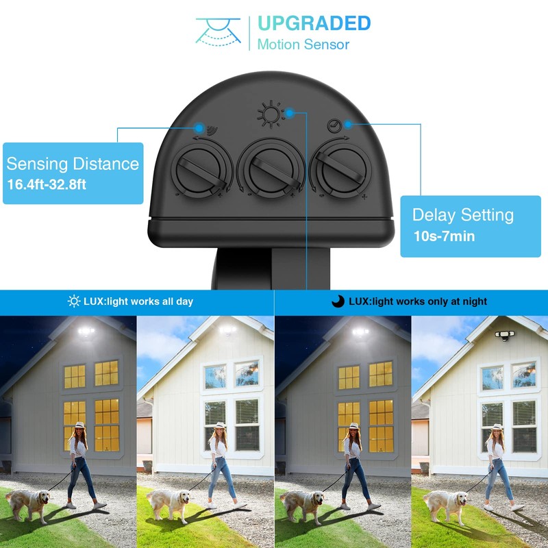 - Adjustable Sensing Mode: You can use the 3 knobs at the back of the sensor to adjust the detection distance, lighting duration and ambient brightness to activate the sensor. Setting the security light to work only at night or both day and night. 180° ultra-wide sensing range, 32.8ft sensing distance and 7~420S continuous illumination time provide you with a larger viewing area for an excellent nighttime experience. Tips: Not Solar Powered