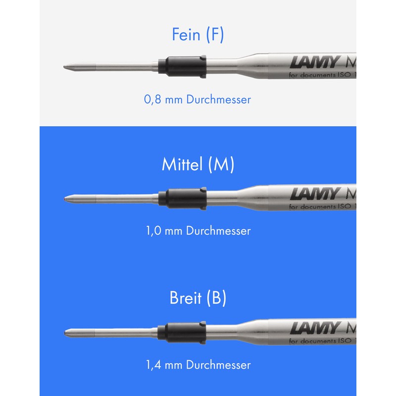 - The Lamy large capacity refills for ballpoint pens made in Heidelberg are available in four colours (black, blue, red, green) and in three font widths (F,M,B)
