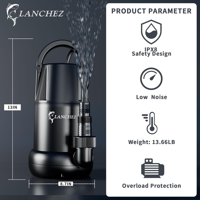 LANCHEZ Sump Pump 3/4 HP 4450 GPH Submersible Water Pump Thermoplastic Portable Utility Pump High Flow Water Removal for Swimming Pool Garden Pond Basement Window Wells with 25ft Long Power Cord