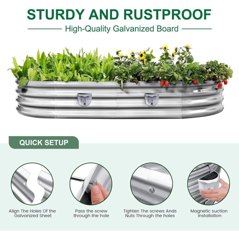 - Energy-saving and eco-friendly: This galvanized raised garden bed kit contains two solar-powered lights and raised bed.The garden lights use solar panel absorbs direct and full sunlight during the day to charge the battery and provide 8-16 hours of warm ambient light at nightfall!