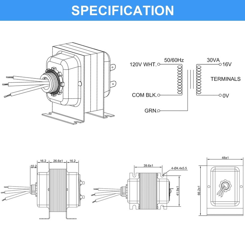 - [Specifications]Input: 120V, 60 Hz; Output: 16V at 30 VA; Low voltage hardwired doorbell power supply for residential, commercial and industrial use, offers reliable performance, safe to use