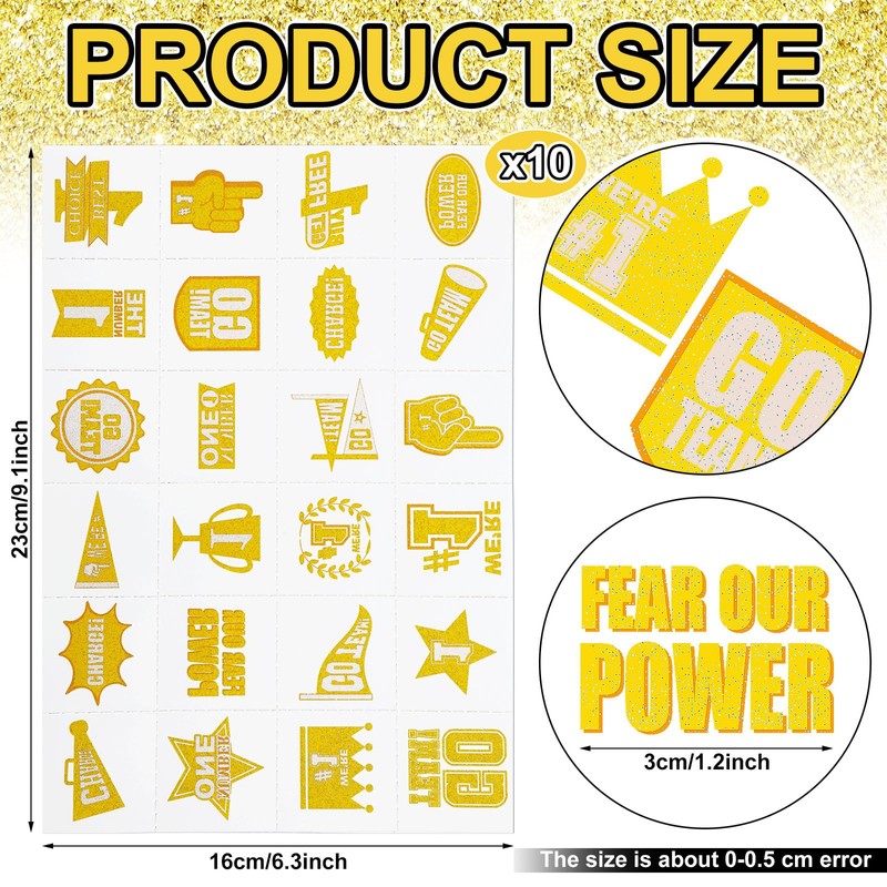- Yellow Team Spirit Glitter Tattoos Package Content: you will get 240 pieces of number 1 glitter tattoos, each sheet contains 24 different styles of glitter team spirit stickers, a total of 10 sheets; The abundant quantity and various patterns offer you many choices to choose the one you like for tattoos making
