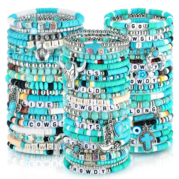 Landical 64 Pcs Turquoise Beaded Bracelets Western Cowgirl Set Heishi Stretch Charm Bohemia Natural Stackable Bracelet Summer Beach Jewelry for Women Men Unisex