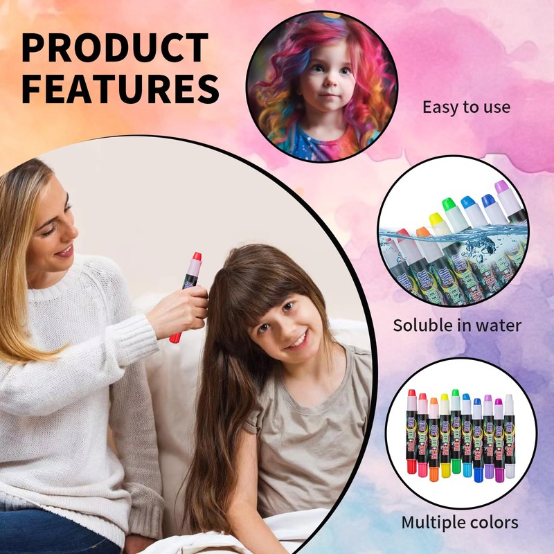 - Easy to use: the children's hair colour is as easy to use as colourful pens. No professional skills required - just a few simple strokes are enough to apply the desired colour to the hair