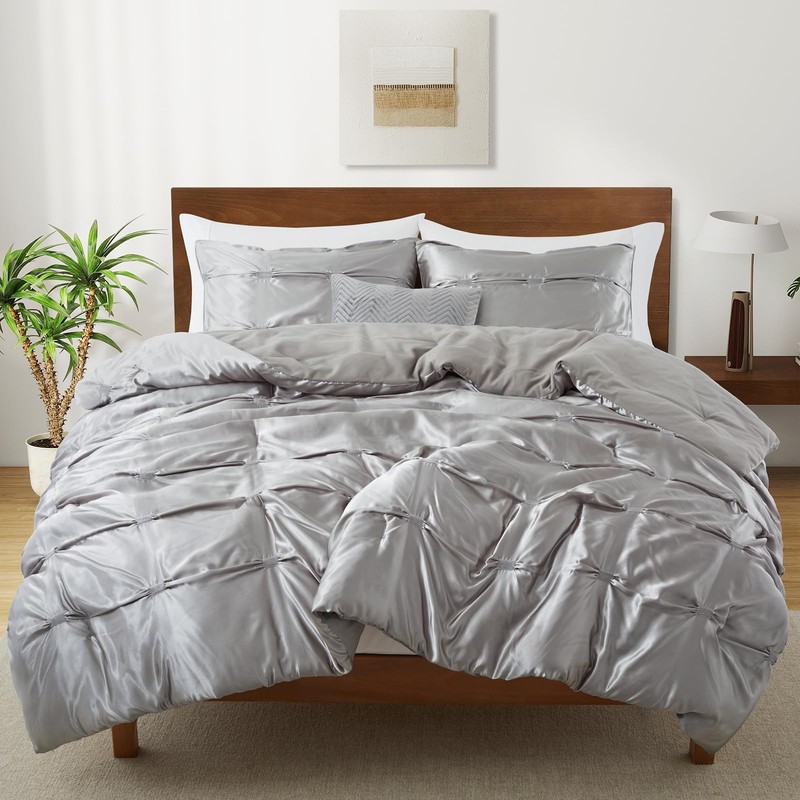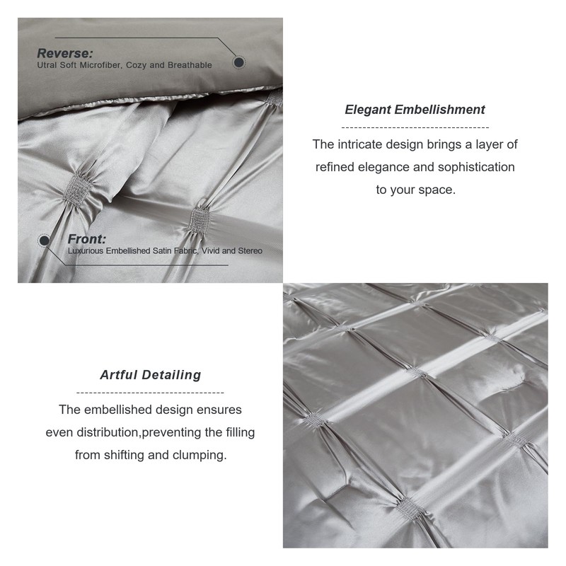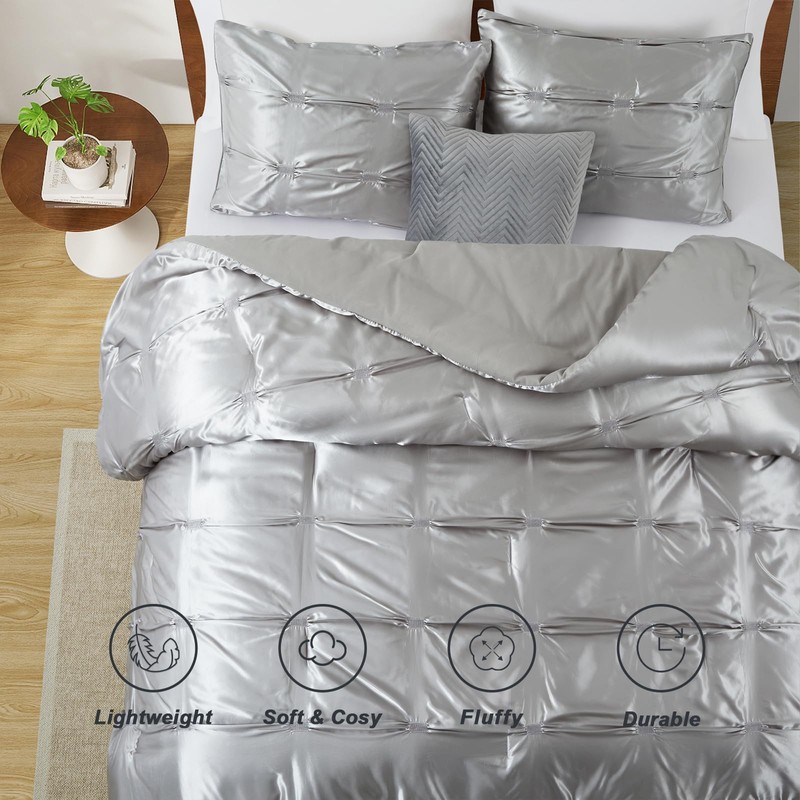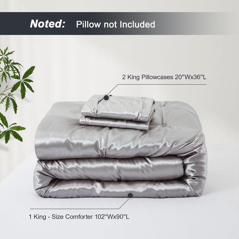 Lanest Housing King Size Satin Comforter Set Grey, 3 Pieces Soft and Lightweight Silk Bedding, All Season Fluffy Down Alternative Comforter Bed Set