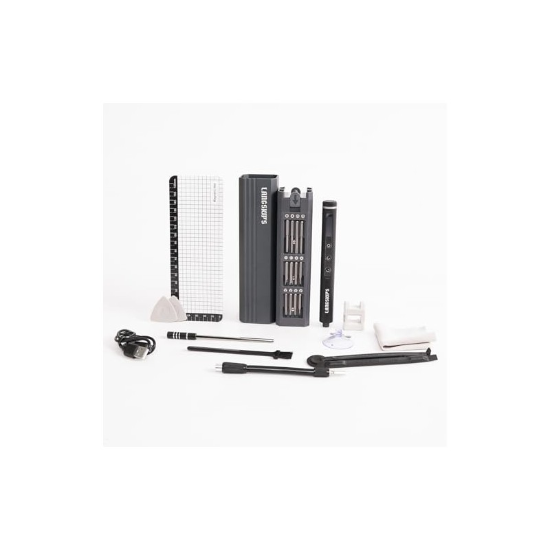 This cordless rechargeable screwdriver set comes with 42 drill bits, a pry bar, and a charging cable, as well as convenient additional accessories such as cleaning cloths and pry bars. Magnetic pads, expansion tools for narrow spaces, and cleaning cloths