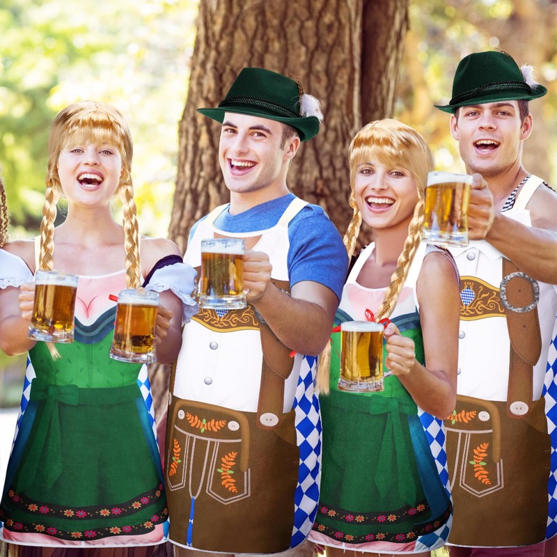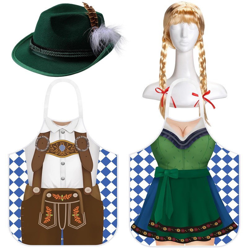 - Oktoberfest Dress up Package: this German costume set includes 1 dark green, feathered hat, 1 wig, and 2 aprons designed specifically for the Oktoberfest; It's an ideal dressing ensemble for couples looking to bring an extra festive atmosphere to their Oktoberfest celebrations