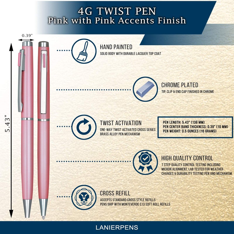 Lanier Matt Pink 4G Ballpoint Pen - Pink Accents and Shiny Chrome Ring & Parts with Medium Tip 0.7mm Cross Style Refill