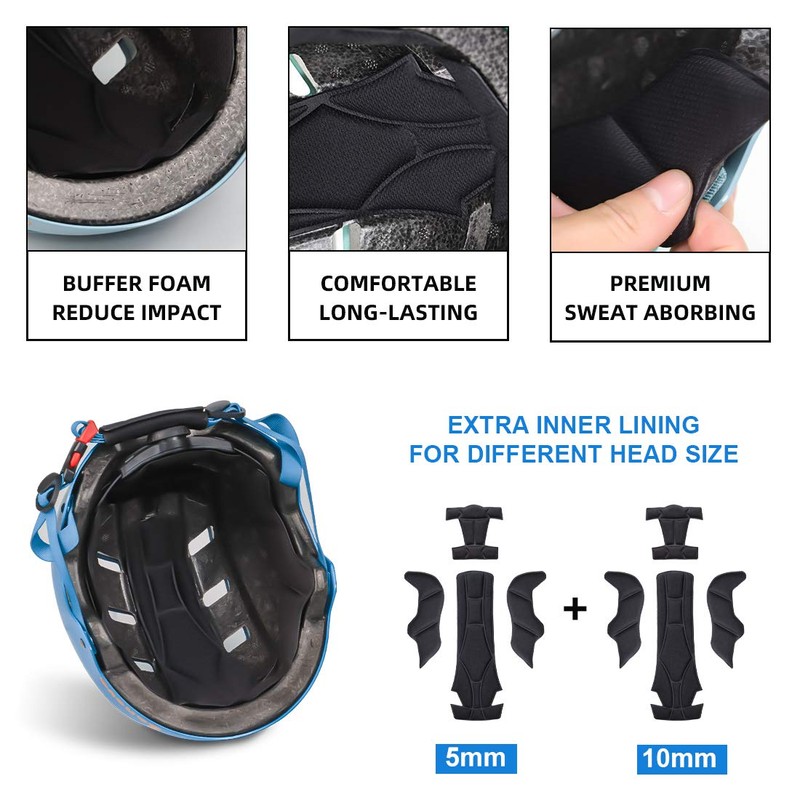 2 sets of inner pads with different thickness(5mm and 10mm) for different head circumferences. EASILY REMOVE the INNER LINING and wash away any sweat.