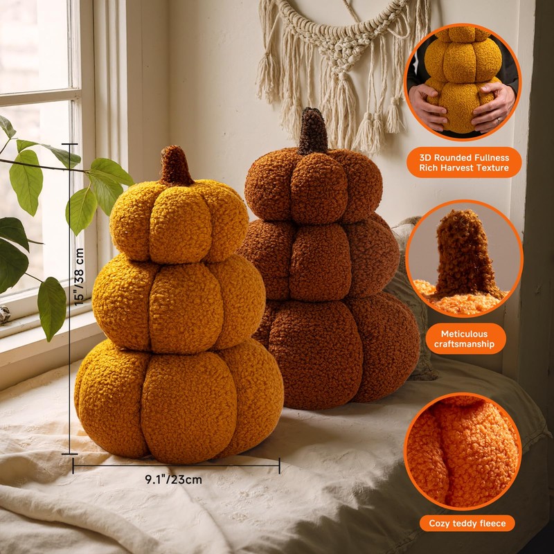 - Product Size: You will receive 1pcs stacked autumn pumpkin pillows which measure approx 15 x 9.1 inch, soft and stretchy and you can easily carry it in your arms. It's big enough to provide you with a warm, cute pumpkin throw pillow can be used in your home, car, room and sofa and so on. Note: Manual made may result in an error of 0.79-1.18 inch