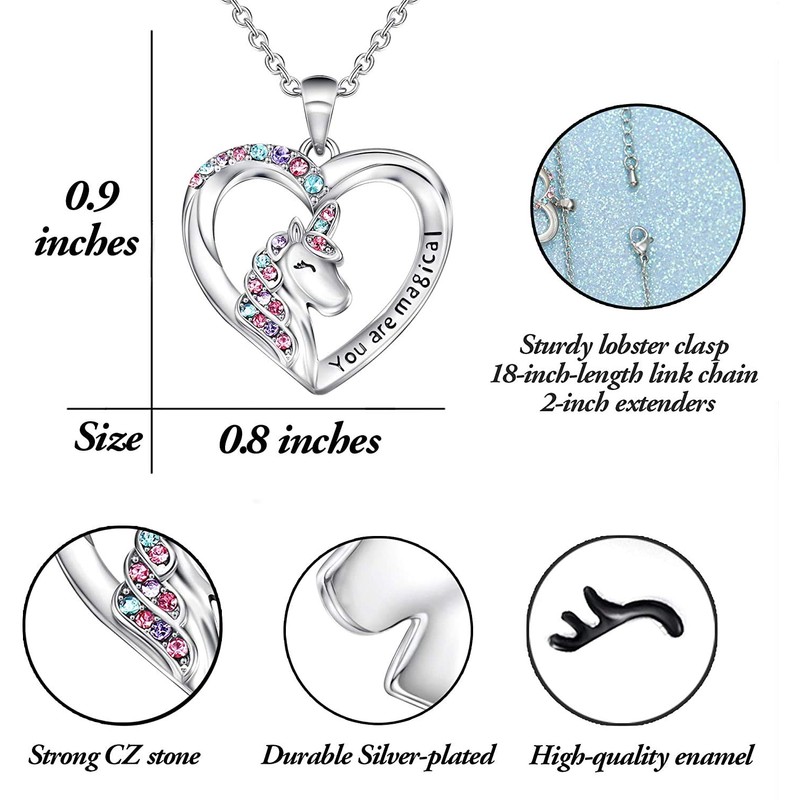 - Unicorn Necklace for Girls - Combined with elements of unicorn and heart, the unicorn is a magical symbol in every girl’s heart. This sparkly unicorn necklace is a great way to express your love for your little princess, and tell them life is Magical and you are magical and unique.