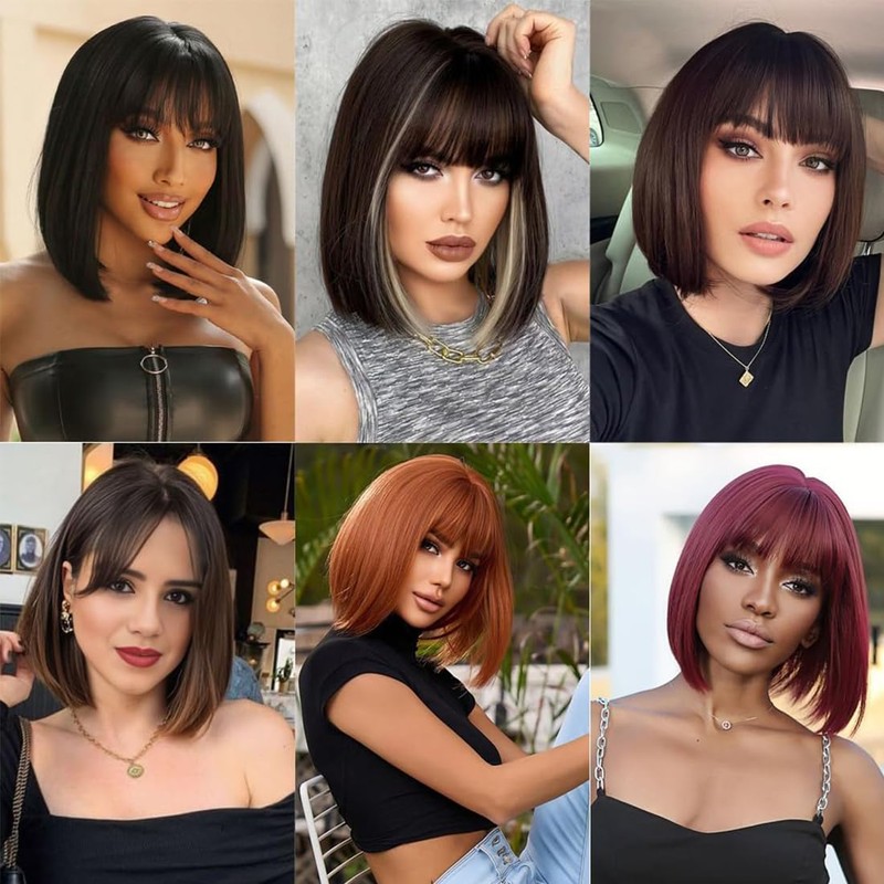 short Bob Wigs With Bangs 12 Inch straight short Synthetic Bob Wigs for Women Natural Looking for Daily Use