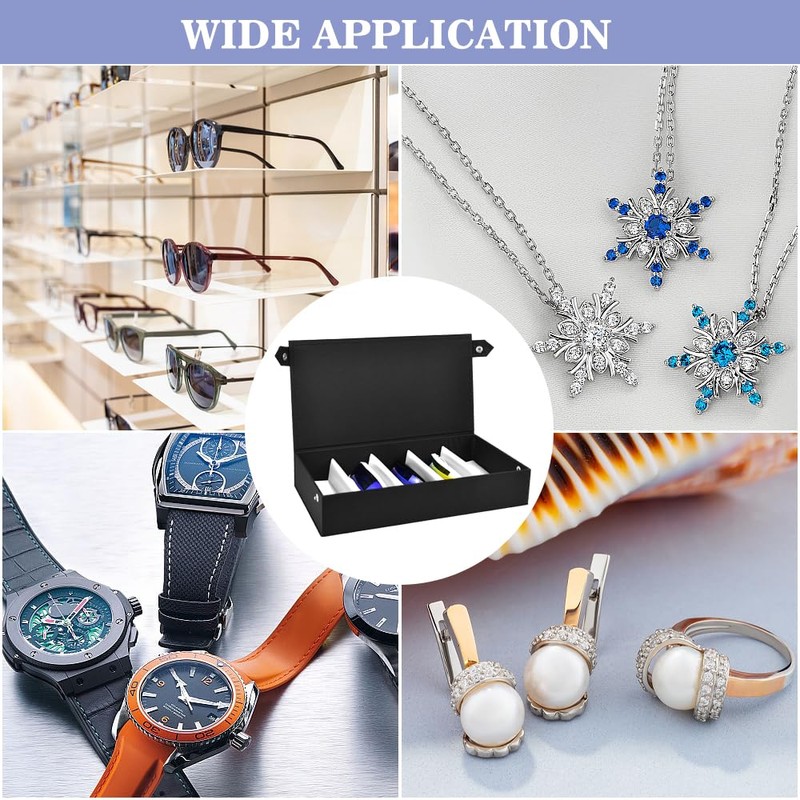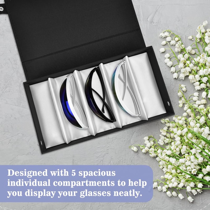 - 5 Compartment Glasses Storage Box: The size of the sunglasses storage box is 32.3 x 17.5 x 6 cm, with 5 spacious independent compartments inside, which can help you neatly organise and display your glasses, watches or jewellery. Keep your belongings organized.