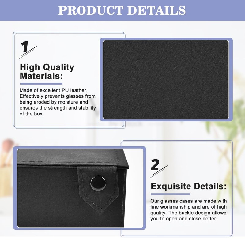 - High-quality material: we use PU leather with excellent moisture resistance, which not only effectively prevents moisture from eroding the glasses, but also gives the storage box a beautiful look. The use of high density cardboard ensures the strength and stability of the box and prevents deformation of the storage box.