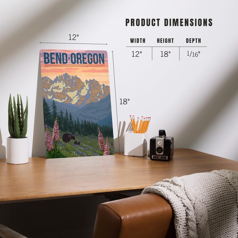 Lantern Press 12x18 Inch Metal Sign, Bend, Oregon, Bear and Spring Flowers