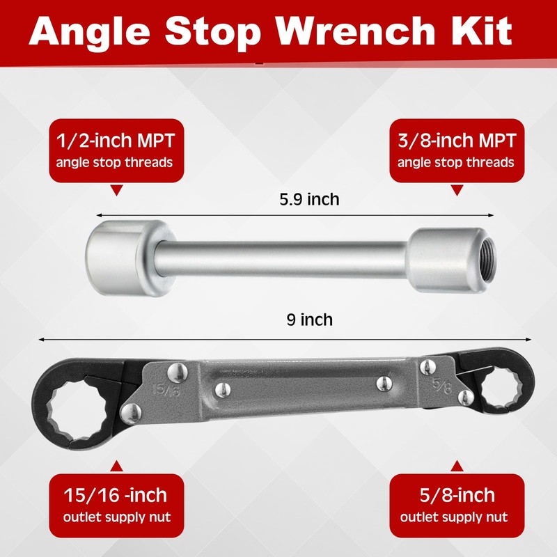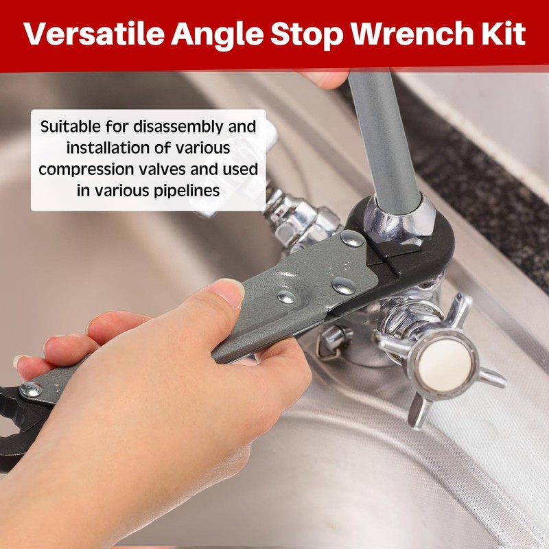 - Angle Wrench Kit: made of materials with a corrosion resistant surface, this wrench ensures long lasting reliability and performance for all plumbing projects, while being lightweight and easy to carry around; The plumber's wrench kit can be applied to install new compression angle stops, remove and replace tightening angle nut stops, and can be applied in a variety of plumbing applications, convenient and flexible