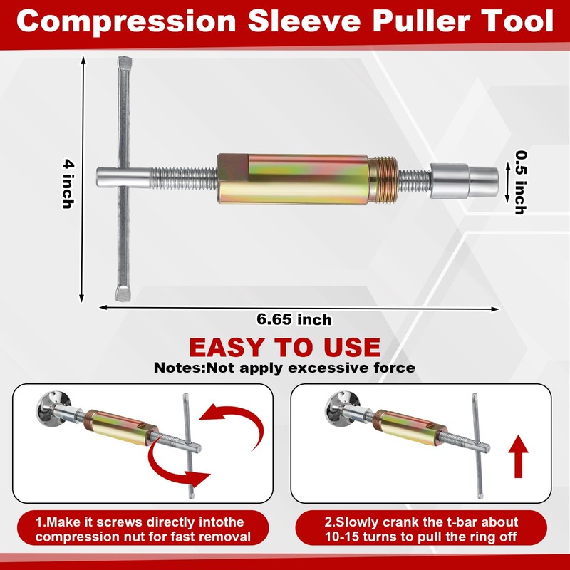 - Easy to Remove Compression Sleeves: the pipe compression sleeve puller is designed to remove compression sleeves and rings from brass pipe, easy to use even in relatively narrow places, can easily remove the compression sleeves without damaging wall, making repair work easy, only suitable for 1/2 inch compression fittings