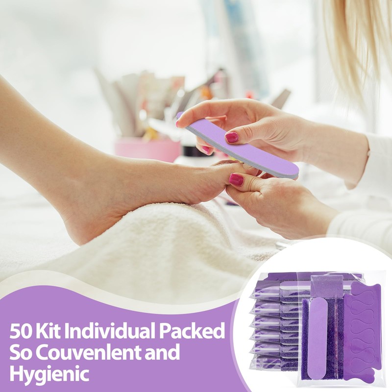 • Disposable Pedicure Kit: unmatched in value, this pedicure kit includes 50 pairs of toe separators, 50 foot pumice stone, 50 nail files, 50 mini buffer, 50 cuticle pusher, and 50 self-adhesive bags. The kit is fully equipped, convenient to use, disposable, and hygienic