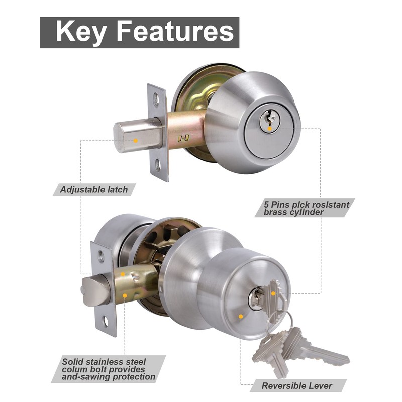 - FEATURES: Entry Door Knob(KEYED ALIKE) and deadbolt(Keyed Outside and Thumb turn button inside) set. Material: Solid Steel; Finished Colour: Satin Nickel.