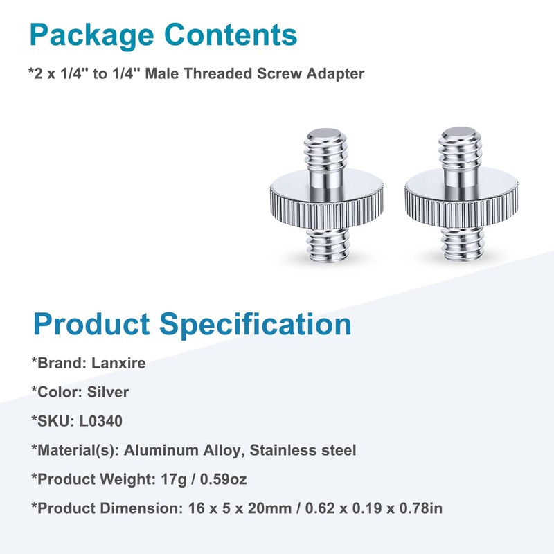 LANXIRE 1/4" Male to 1/4" Male Threaded Tripod Screw Adapter, Double Head Stud Mounting Thread Converter for Camera, Monitor, LED Light, Microphone, Shoulder Rig - 2 Packs