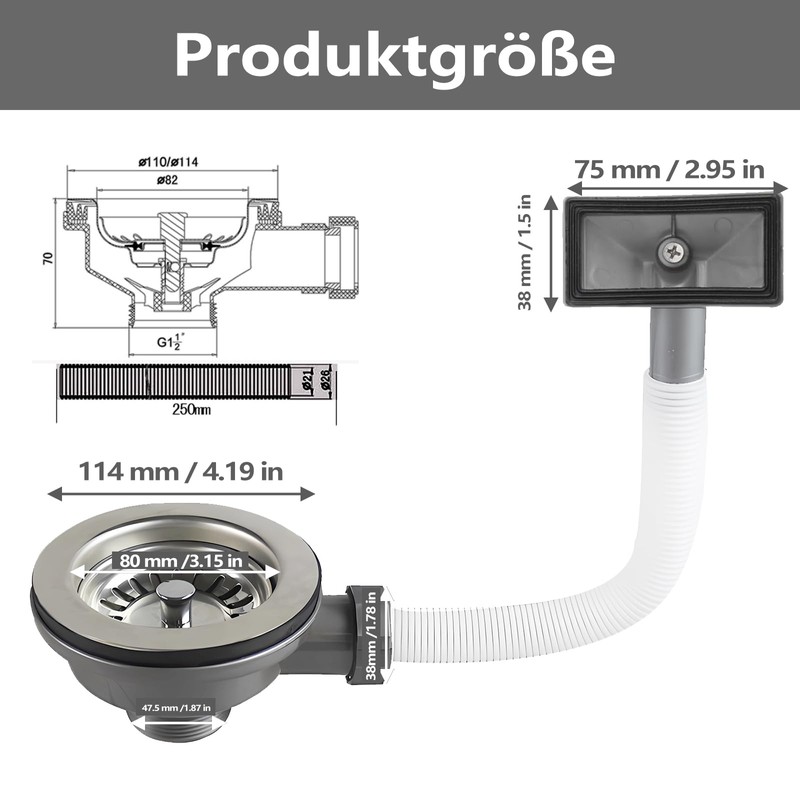 - Notes on the dimensions: the strainer basket valve has a diameter of 114 mm (approx. 3 1/2 inches) and therefore fits perfectly with most standard stainless steel sinks. When purchasing, make sure that the diameter of your sink matches this dimension to ensure optimal tightness and functionality