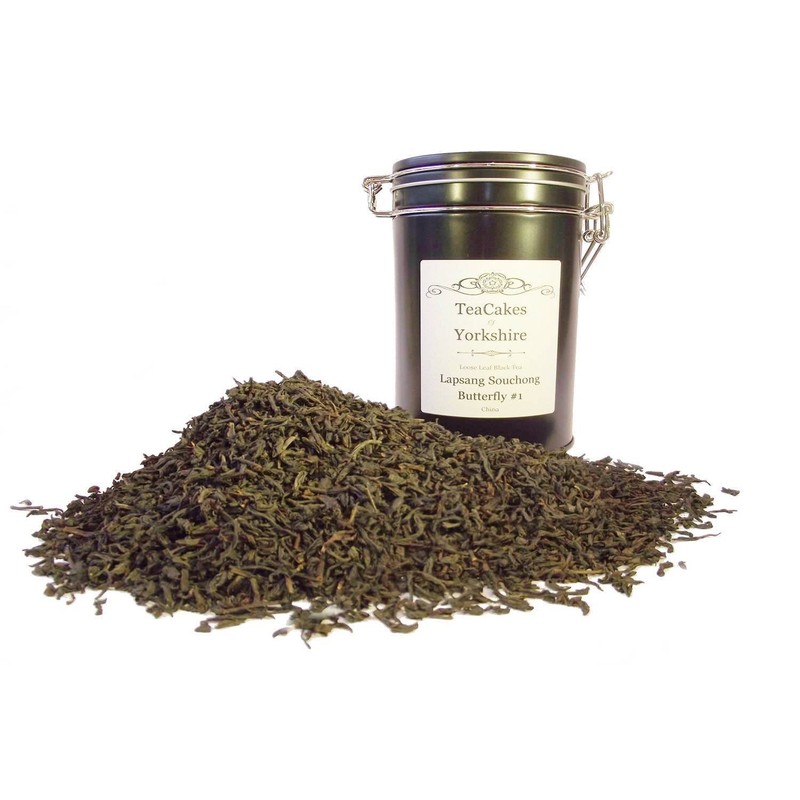Lapsang Souchong Tea Gift Set Butterfly #1 Black Loose Leaf Tea Wrapped 100g in Caddy with Tea Strainer and Measuring Spoon by TeaCakes of Yorkshire