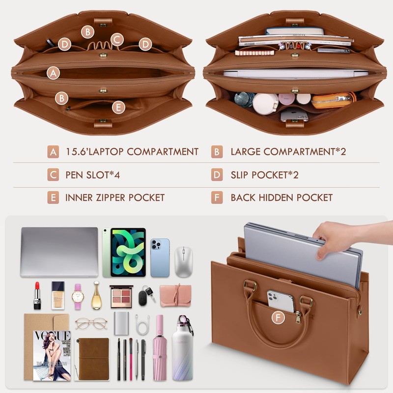 - Perfect Size:The computer bag for women measures 16.9 (L) x 5.9 (W) x 12.6 (H) inches and weighs 2.71lb, this size is perfect for your laptop and all the essentials you'll need. The top handle has a height drop of 6.69 inches and the detachable adjustable shoulder strap has a length of 28.35-50 inches for women of different heights. You can use it as a women's briefcase, teacher's handbag, crossbody bag or university shoulder bag, a variety of ways to carry, convenient and comfortable