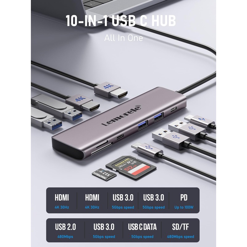 - 10-in-1 Docking Station: The Lemorele USB-C Docking Station transforms your laptop or desktop’s Type-C / USB-C / Thunderbolt 3 port into a versatile hub, featuring Dual HDMI, 3x USB 3.0, 1x USB 2.0, 100W PD fast charging, and an SD/TF card reader. The USB-C port is dedicated to data transfer only. This adapter is plug-and-play, requiring no drivers or software, and all ports can be used simultaneously to connect multiple devices at full capacity. It’s lightweight, compact, and designed for maximum convenience.
