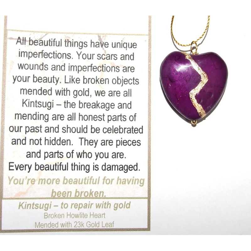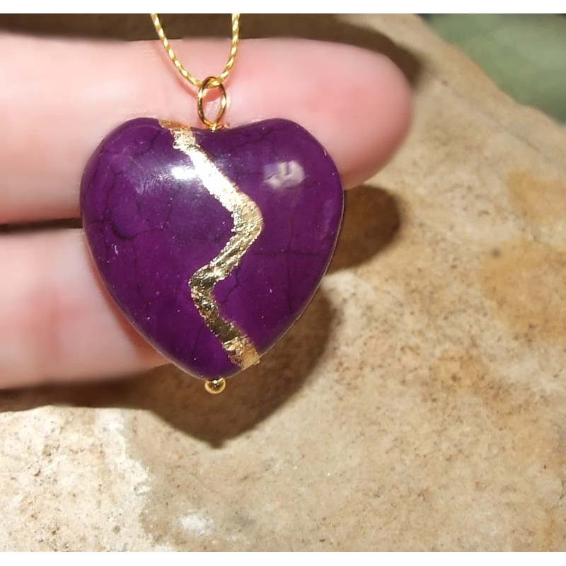 Large 1" Purple Howlite Broken Heart Mended with 23k Gold, Kintsugi Cord Necklace