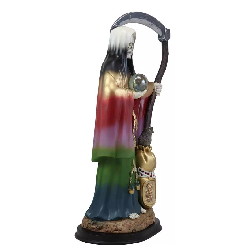• This figurine is a personification of the Holy Death Mother Santa Muerte in Several Outfits for her different power spectrum. The glass ball symbolizes the world, the scythe demands the end of things or execution of powers, the scales represent justice and the owl sitting on the bag of gold symbolizes wisdom and guidance.