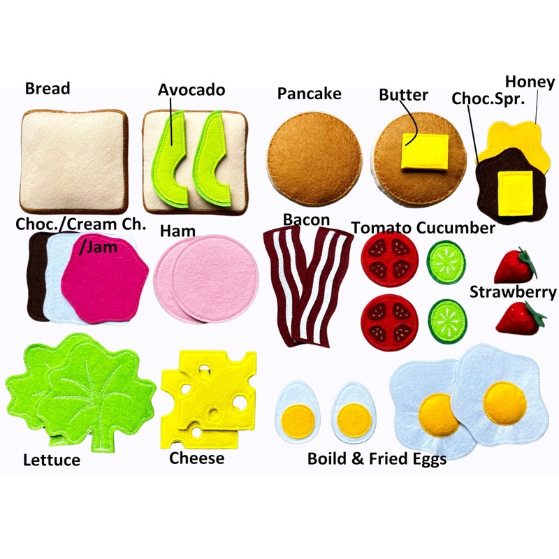 - 31-PIECE DURABLE FELT FOOD SET: Handmade Felt Play Food Breakfast Set includes 18 types of food, 31 durable pieces as listed in description.