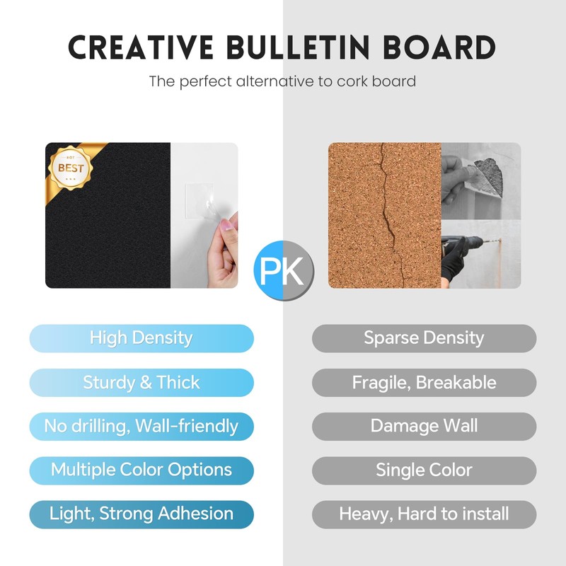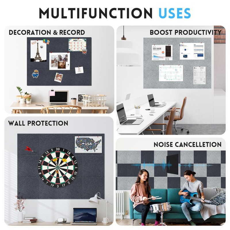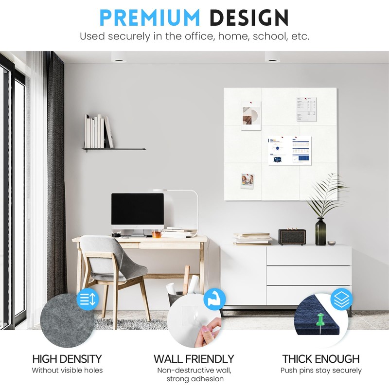 - Perfect Cork Board Alternative - Replace your old-fashion bulletin board with our more affordable and stylish felt board, this customizable pin board is more suitable for home, office, school and any other spaces. The set includes 6 pack felt wall panels, 50 push pins, 30 adhesive tabs and user manual.