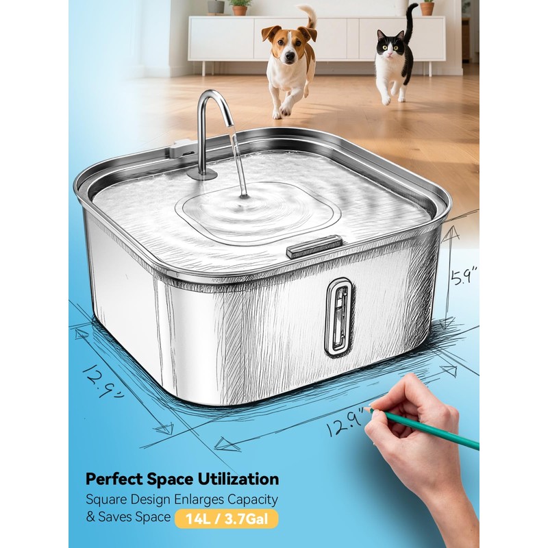 Large Dog Water Fountain 14L/3.7Gal, Stainless Steel Pet Fountain for Large Dogs and Multi-Pets Families, with Visible Window & Extra Wide Drinking Area, Square Design Enlarges Capacity & Saves Space
