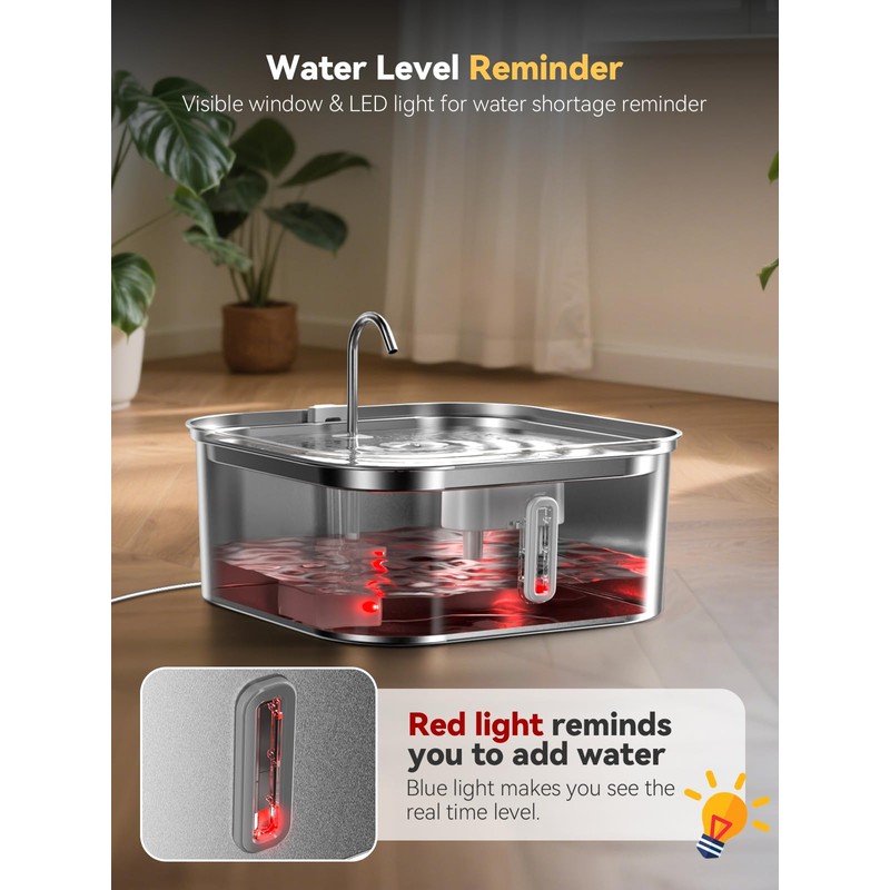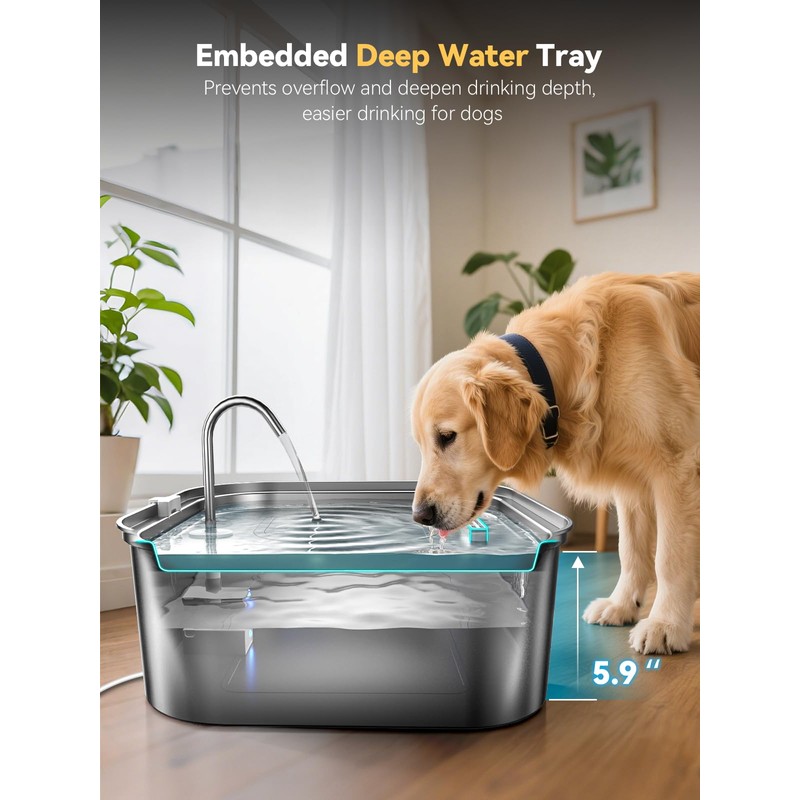 - Embedded Deeper & Wider Tray: Our pet water fountain solves shallow bowl struggles! The deeper water tray is more in line with the dog's tongue-rolling drinking habit to reduce splashing, and the wider water surface allows your pets to freely choose the angle of drinking, and no longer only lick the edge because of the space limitation to reduce overflowing.