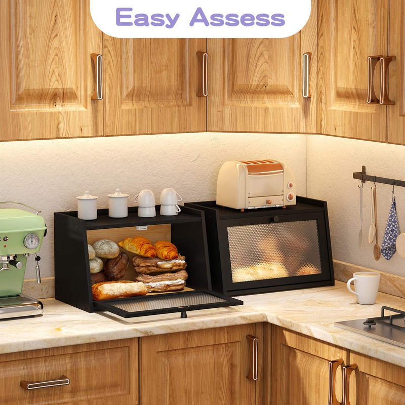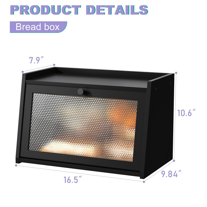 Keep your bread fresh and your kitchen countertop organized with this large bread box. Crafted with a farmhouse design, this bread container offers ample storage space for loaves, buns, and more. The transparent window allows you to easily see the contents without opening the lid, while the black finish adds a touch of rustic charm. this bread holder is the perfect size for most kitchen countertops. Its sturdy construction ensures durability, making it a practical and stylish addition to your kitchen. Maintain the freshness of your baked goods and keep your countertop clutter-free with this versatile bread box.