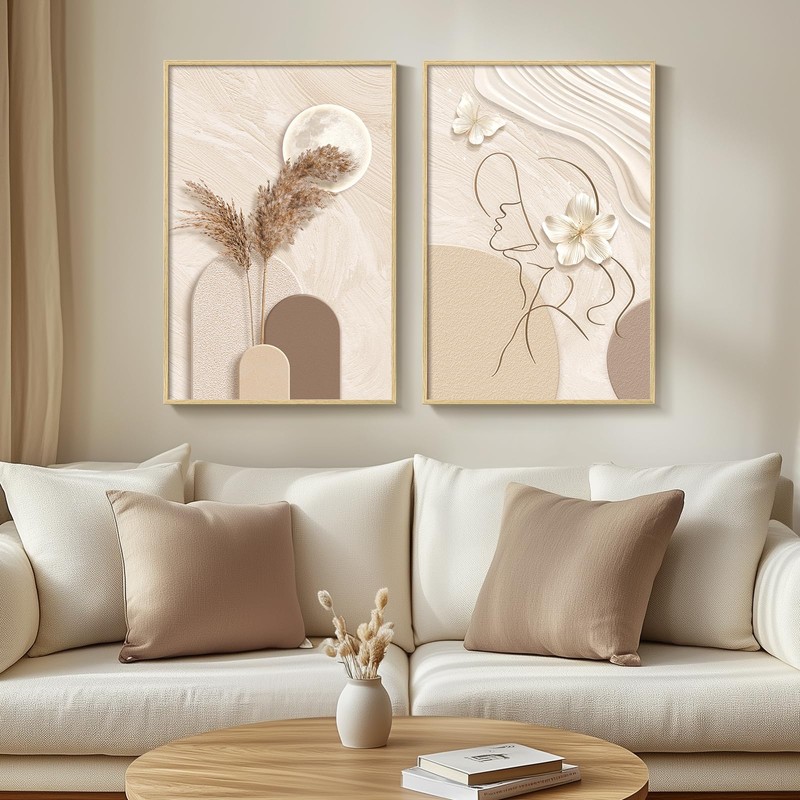 - [Modern Elegant Wall Art]: The two paintings mainly use beige, light brown and white, and the overall neutral tone is very soft, giving people a feeling of peace and harmony. In the painting on the left, the combination of the moon and dried flowers creates a natural and mysterious atmosphere, and in the painting on the right, the simple lines of the human outline and the design of flowers have a kind of abstract art aesthetic. Very suitable for decorating the living room, bedroom, dining room, study or bathroom and other scenes, can create a warm and comfortable atmosphere