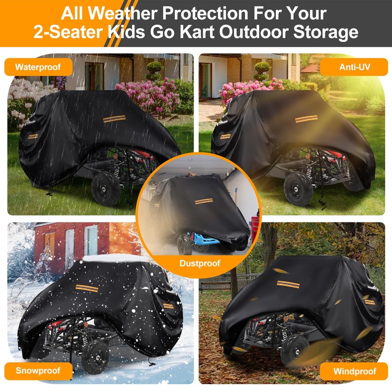 - All-round Protection For Your Go Kart:2 Adjustable and elastic fixed windproof buckles (Front and back, left and right), the go-kart car cover can be tightly fixed on your go cart even in stormy weather, making your two seater go-carts safe, reliable and dry.The go karts accessories that truly resist the wind, rain, sun and snow.All seasonal heavy duty protection, indoor and outdoor can be used.