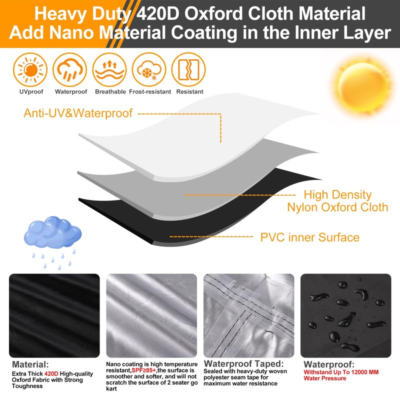 - Extra Thick 420D Material:Go kart covers waterproof are made of extra thick 420D oxford fabric with Nano material triple coating inside, so the inner layer is extra smooth, soft and won't scratch your go kart.SPF>85+.Double-needle sewing process at the joints, adding waterproof strips, able to resist 5000 MM water pressure. Compared with other portable go kart cover, it is better in tear resistance and UV resistance.All-round protection for your kt196 go-kart.