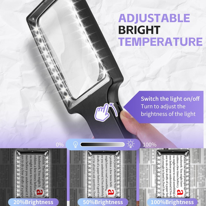 - MAGNIFIER WITH LIGHT STEPLESS DIMMING: 20pcs high life chip LED light beads are used to achieve free reading in different environments. Achieve 0-100% brightness precision control through the infinitely dimmable button, effectively relieve visual fatigue in different environments.
