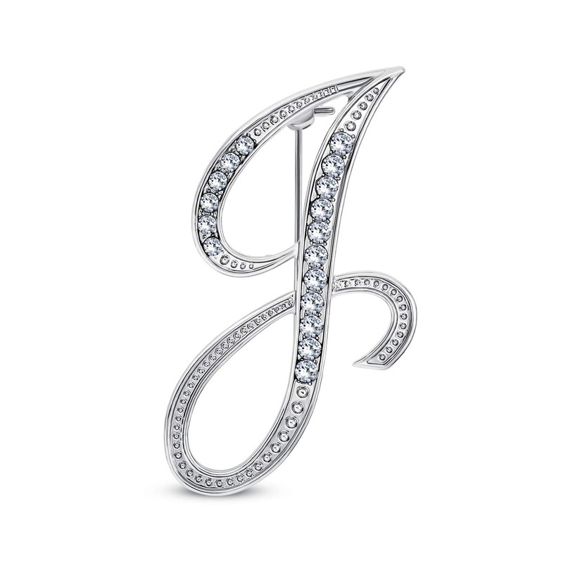 Large Statement ABC Pave Crystal Cursive Script Monogram Letters Alphabet Initial J Scarf Lapel Pin Brooch For Women Silver Plated