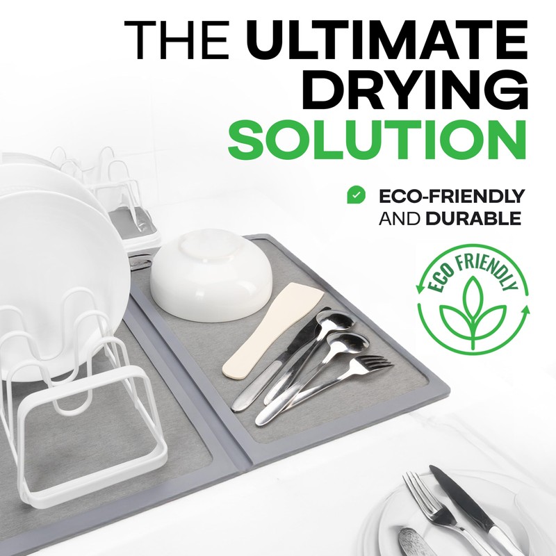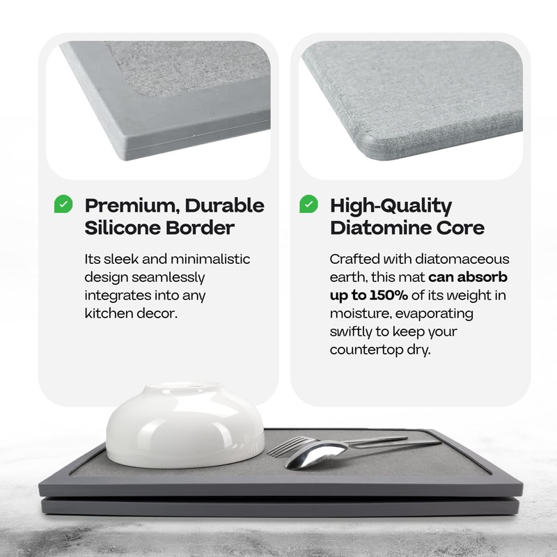 - GENEROUS SIZE & PREMIUM MATERIALS: Our dish drying mat, 17 x 28-inch made with a highly absorbent diatomaceous earth core and a sturdy silicone border, it delivers exceptional functionality while complementing any kitchen decor with its sleek design.