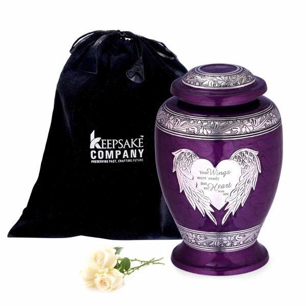 Keepsake Company's Large Purple Urn with Angel Wings Heart Design: Losing a loved one is a challenging period, and the most difficult phase in the world is the willingness to accept and move forward. This is why Keepsake Company wants to ease your burden with a reliable adult urn that will belong anywhere you display it.