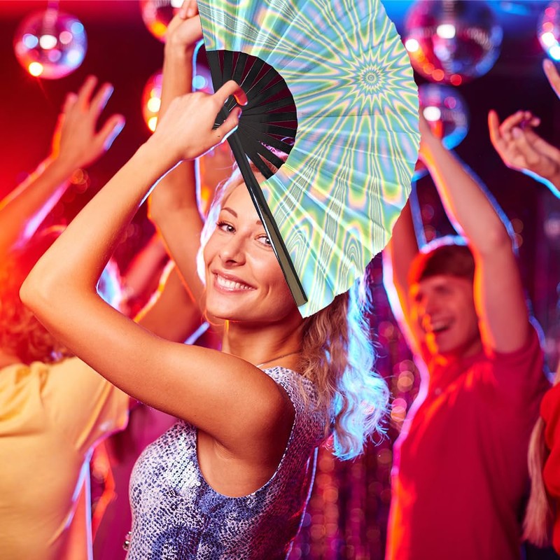 Large UV Illuminated Carnival Folding Hand Fan - Nightclub & Pool Party Bar Click Nylon Cloth Fan - Eye-catching hand fan, 13 inches, perfect for holiday accessories(FLASH OF LIGHT)