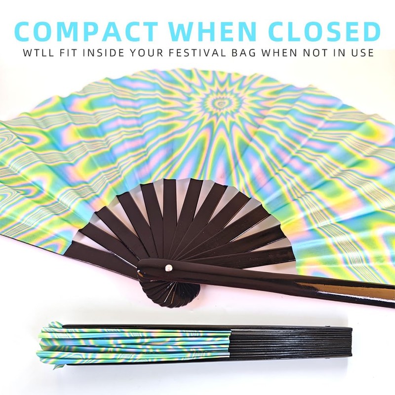 UV Luminous Folding Fan - Large Folding Bamboo Hand Fan - Colorful Carnival & Party Clack Hand Fan for Halloween, Day of the Dead, Disco & Dance - Eye-catching bamboo frame handheld fan, durable nylon fabric,