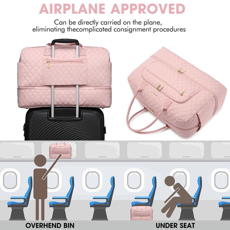 - Travel Tote Bag with Shoe Compartment: Separate flat bottom compartment of this women pink bags can hold your shoes or dirty clothes for easy separation from clean clothes when traveling. Keeps you organized and takes the hassle out of packing. If you're a novice mother, the bottom part is also perfect for storing diapers, wipes, diaper bag items. It can also be used as a hospital bag, mommy bag and medical bag