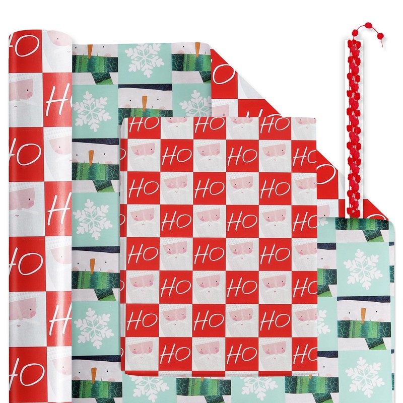 LaRibbons Reversible Christmas Wrapping Paper Roll with Red Pom Pom, Santa Ho and Snow Flakes Checkerboard Printed Gift Wrap Paper for Xmas, Party Celebration, 17 Inch X 40 Feet (56.6 sq.ft.ttl.)
